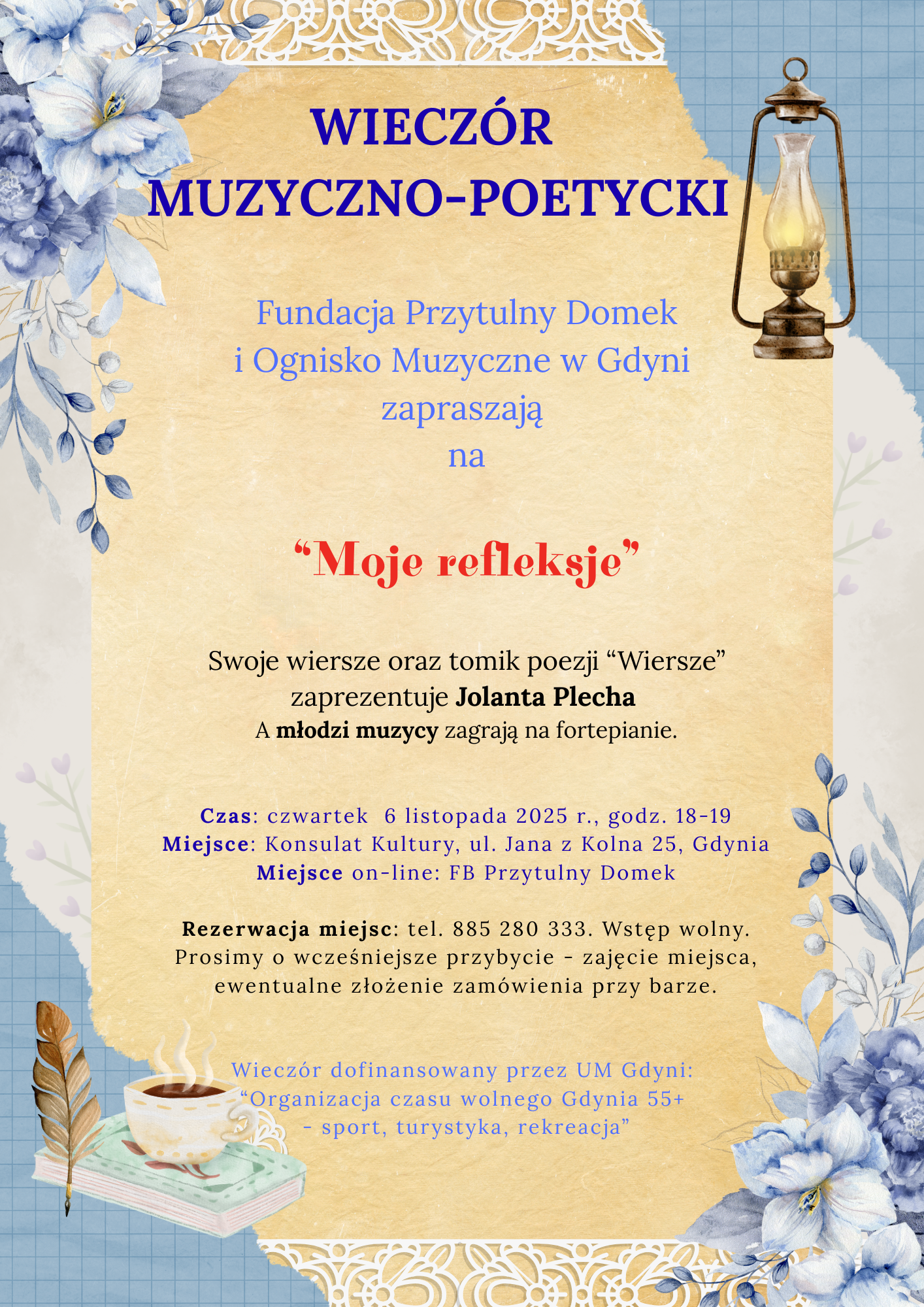 Fundacja Przytulny Domek serdecznie zaprasza na wieczór muzyczno-poetycki „Moje refleksje”. Wiersze zaprezentuje Jolanta Plecha. Muzyka na żywo na pianinie w wykonaniu uczniów z Ogniska Muzycznego w Gdyni.