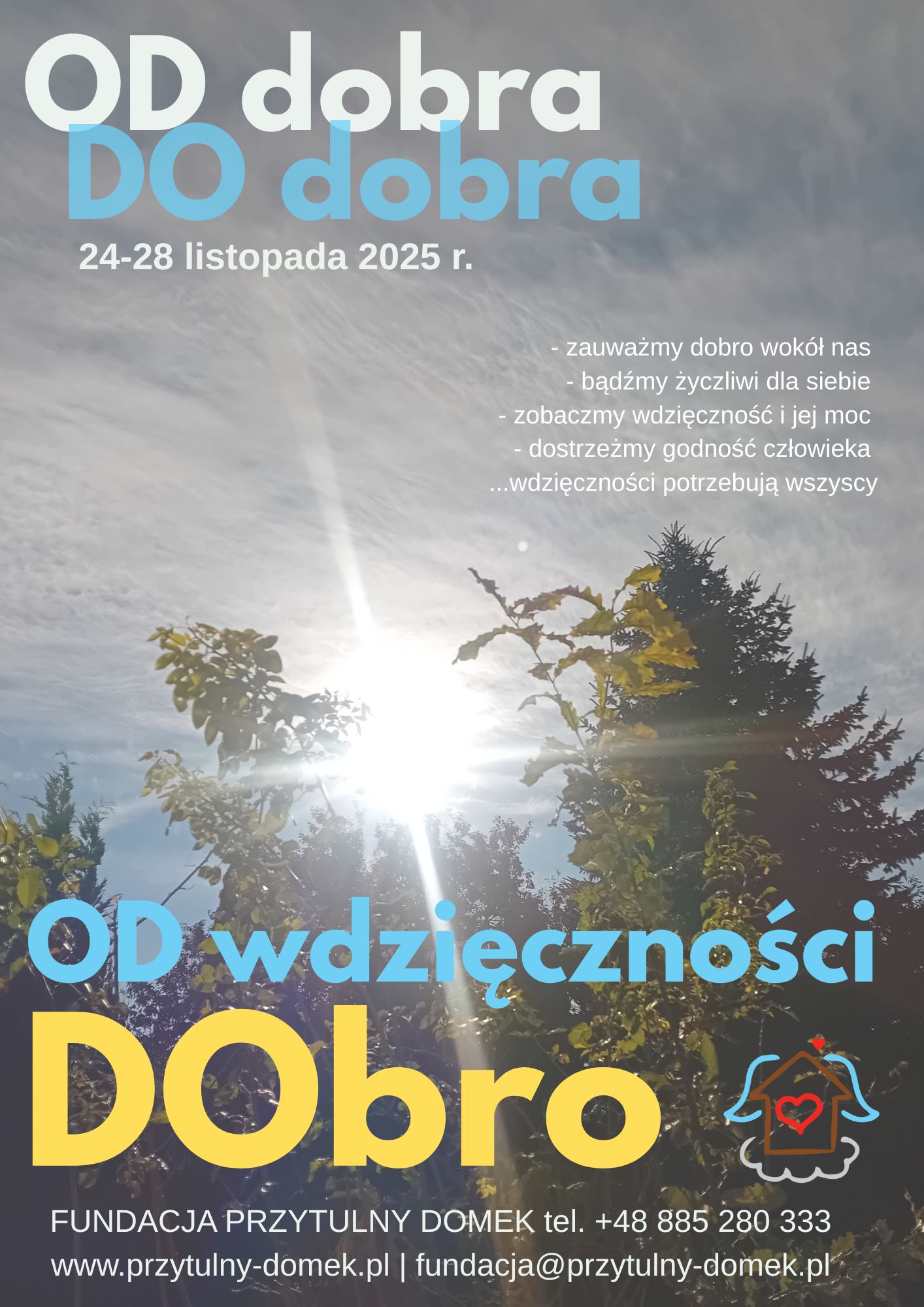 Fundacja Przytulny Domek serdecznie zaprasza szkoły i przedszkola do przyłączenia się i zrealizowania w dniach 24-28 listopada 2025 r. projektu edukacyjnego „OD Dobra DO Dobra.” Tegoroczna szósta edycja jest pod hasłem „ODwdzięczności DObro”.