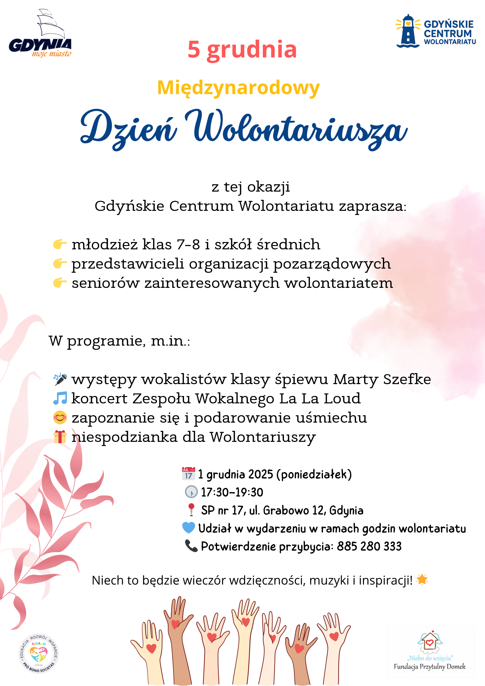 W programie: – występy klasy śpiewu Marty Szefke – koncert Zespołu Wokalnego La La Loud – niespodzianka dla Wolontariuszy
